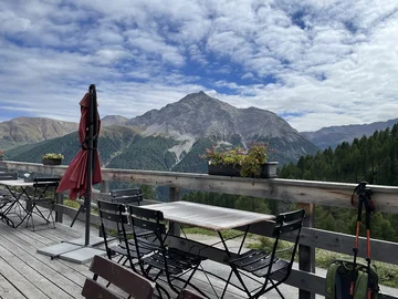 Auf dem sonnigen Sitzplatz vor dem Hotel Crusch Alva löschen wir unseren Durst.