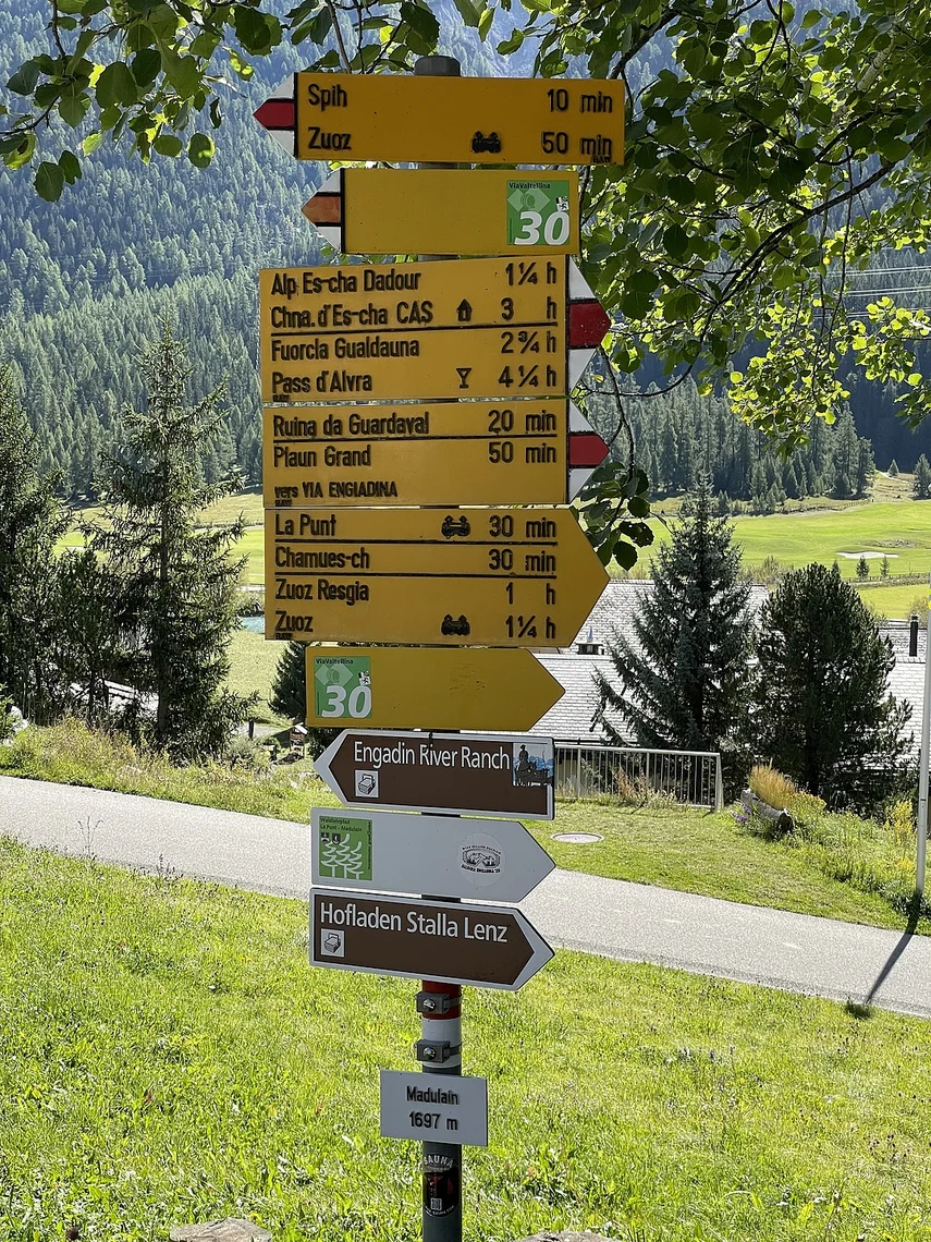 Anstelle des direkten, steilen Bergweges dem Bach Ova d'Es-cha entlang, nehmen wir zunächst den Fahrweg durch das Dorf unter die Füsse. Im kontinuierlichen Aufstieg haben wir einen schönen Tiefblick auf Madulain und La Punt.