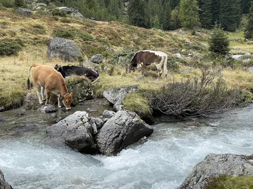 Bei der Schürlialp (1958 m) begleiten uns zunächst einige langzottige Yaks bevor sie uns dann doch den Weg überlassen. Vorbei geht's an mehreren Alpen mit den typischen Walserhäusern und Ställen sowie weidenden Pferden und Kühen.