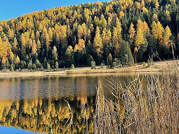 Auf den schönen, teilweise mit Lärchennadeln bedeckten, Wegen der Routen Nr. 30 Via Valtellina und Nr. 33 Via Albula/Bernina wandern wir durch die Wälder des Val Bernina nach Pontresina. Vorbei am Bahnhof (1778 m) führt uns ein kurzer Aufstieg durch den Wald zum Lej da Staz (1810 m). Wir bestaunen und geniessen die wunderschöne Natur mit den Spiegelungen im idyllischen Bergsee.