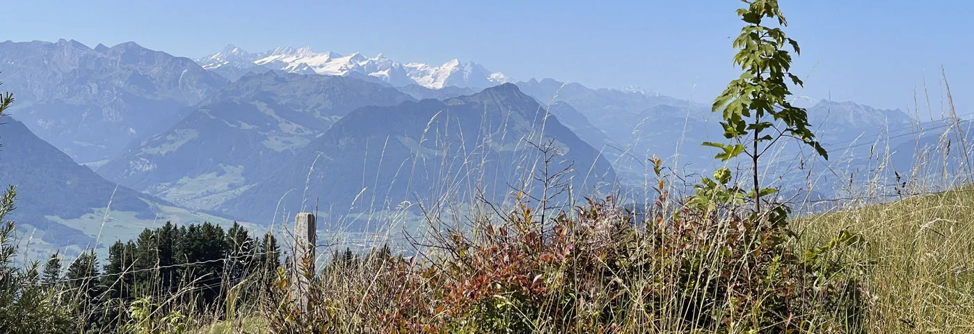 An der Schwing-Arena (Rigi-Schwinget) vorbei wandern wir der Bahnlinie entlang zur Staffelhöhe (1593 m). Nach dem Startplatz der Gleitschirmflieger treffen wir auf ein schönes Bänklein. Hier geniessen wir nicht nur unser Picknick aus dem Rucksack sondern auch die prächtige Aussicht mit den verschneiten Berner Alpen.