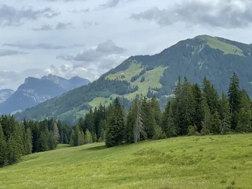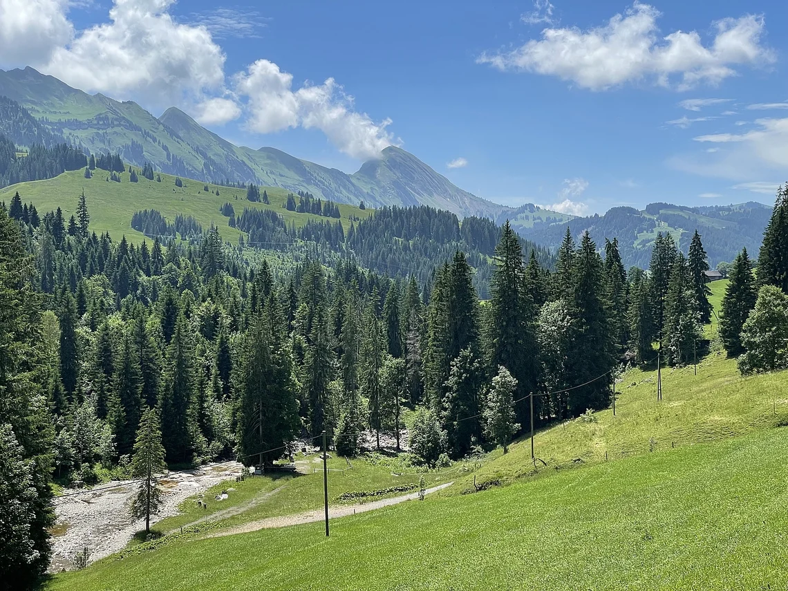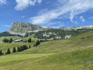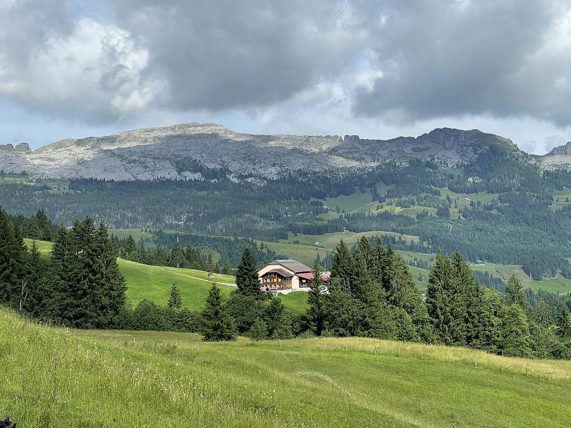 Das Restaurant Rossweid lassen wir links liegen und durch das UNESCO Biosphären-Reservat Salwide gelangen wir zum höchsten Punkt unserer Tour auf 1448 m. Schöne farbige Wiesenblumen sowie eine prachtvolle Rundsicht auf die Schrattenfluh und die umliegenden Berge geniessen wir hier.