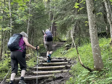 Bei leichter Bewölkung und angenehmer Temperatur nehmen wir den Aufstieg zur Rossweid (1437 m) unter die Füsse. Über Treppenstufen und Wurzelwege gewinnen wir rasch an Höhe. Vereinzeltes Vogelgezwitscher und das Gurgeln des Bächleins begleiten uns.