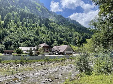 Auf der Fahrstrasse wandern wir hinunter zum 2023 neu renovierten Berggasthaus Salwideli (1351 m). Auf der schönen Terrasse trinken wir einen Kaffee.