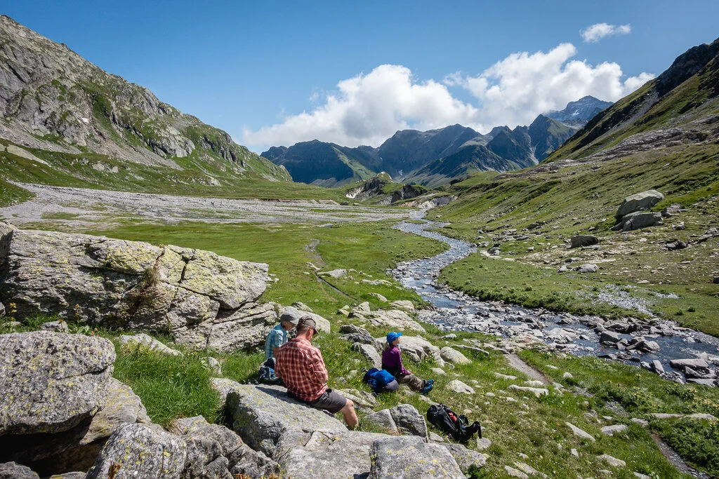 Wir steigen rechts an den Felsen des Muot la Greina vorbei zur Greina-Hochebene auf. Murmeltiere berüssen uns. Die Greina ist eine Naturschönheit mit zahlreichen Sümpfen, ausgedehnten Schafweiden und einer imposanten Bergkulisse.