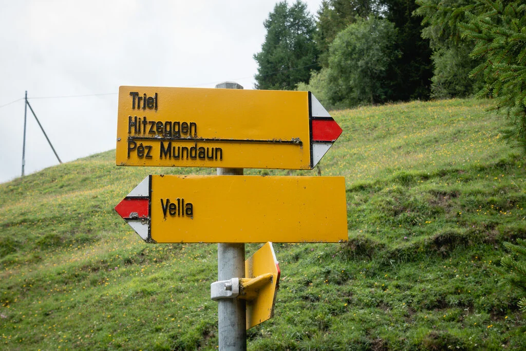 Beim Verlassen des Hotel Surselva in Surcuolm/Obersaxen (1348m), wo wir übernachtet haben, ist es noch kühl und verhangen. Glücklicherweise haben Regen und Gewitter aufgehört. Sie haben unsere geplante Wanderung vom Vortag von Disentis nach Trun buchstäblich im Wasser versinken lassen.
