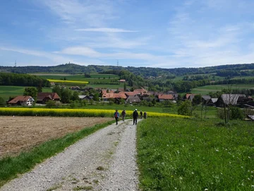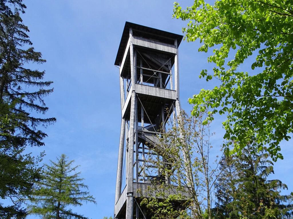Bei Sonnenschein verlassen wir dieses Dorf mit den vielen schönen Häusern. Vorbei an blühenden Rapsfeldern und der Rudolf Minger-Gedenkstätte erreichen wir Bütschwil (656m) mit einem ersten Weitblick in die Berge. Vorwiegend durch Wald wandern wir zum Chutzenturm (820m) auf dem Frienisberg. Dieser 45m hohe Turm ist der höchste Holzturm der Schweiz (Stand 2017). Die oberste Aussichtsplattform auf 40m besteigen wir über 234 Stufen. Wir erfreuen uns an der schönen Rundsicht, obwohl die Fernsicht nicht besonders klar ist.